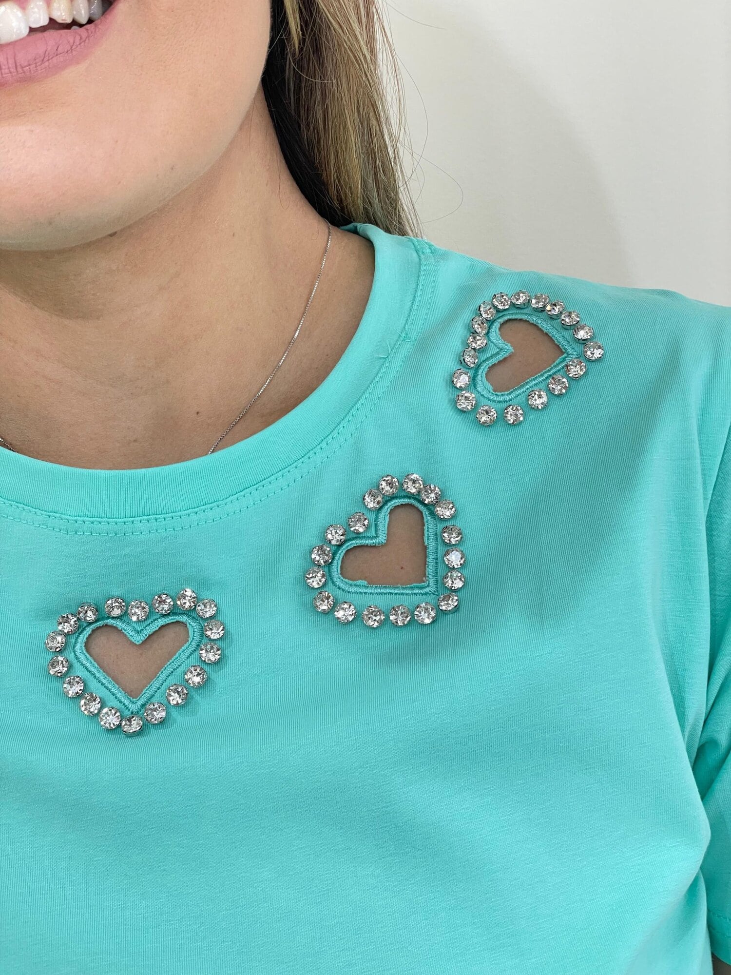 - Aplicações de corações vazados contornados por pedrarias.