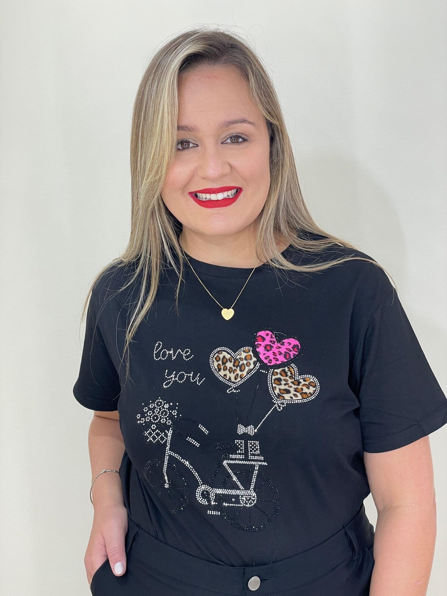 - Detalhes em strass aplicados na estampa, trazendo um brilho discreto e sofisticado;