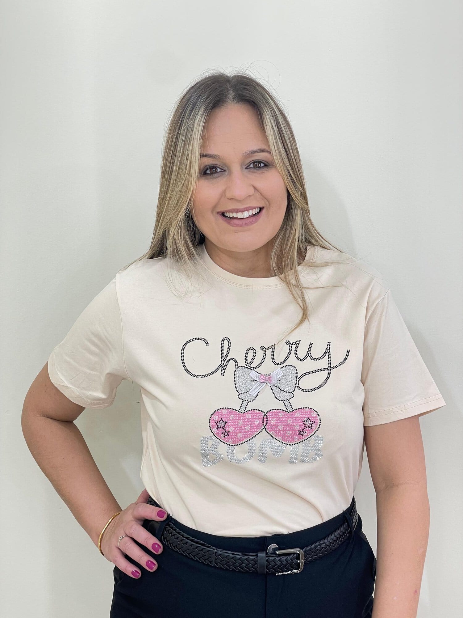 - Estampa frontal com o texto “Cherry Bomb”.