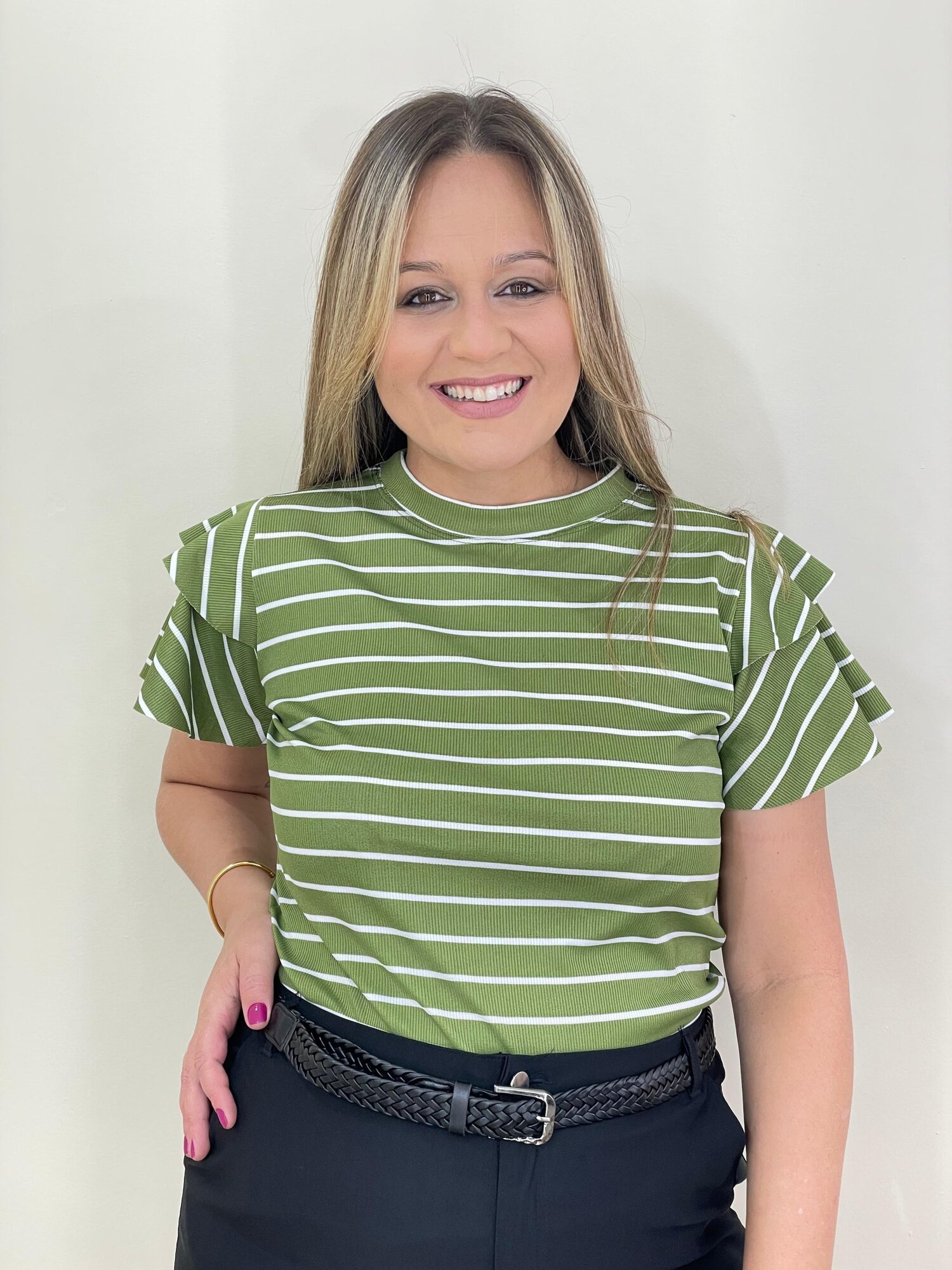 A Blusa Thalia é perfeita para quem busca um visual moderno, delicado e confortável. Seu diferencial está nas mangas com babado duplo, que trazem movimento e feminilidade ao look, além da estampa listrada que é atemporal e estilosa.