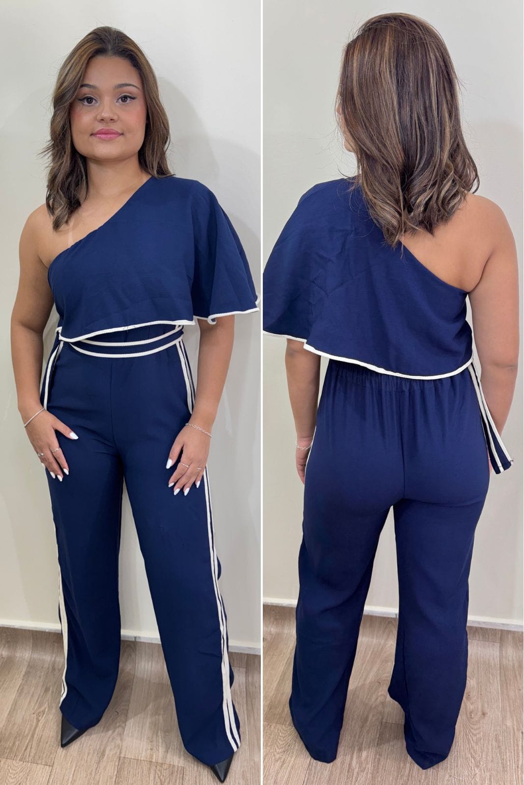 O Macacão Violette é a união perfeita entre sofisticação e modernidade. Com design assimétrico de um ombro só, ele traz um visual elegante e atual, ideal para mulheres que buscam estilo com conforto. O detalhe em viés contrastante valoriza a peça e adiciona um toque fashion exclusivo.