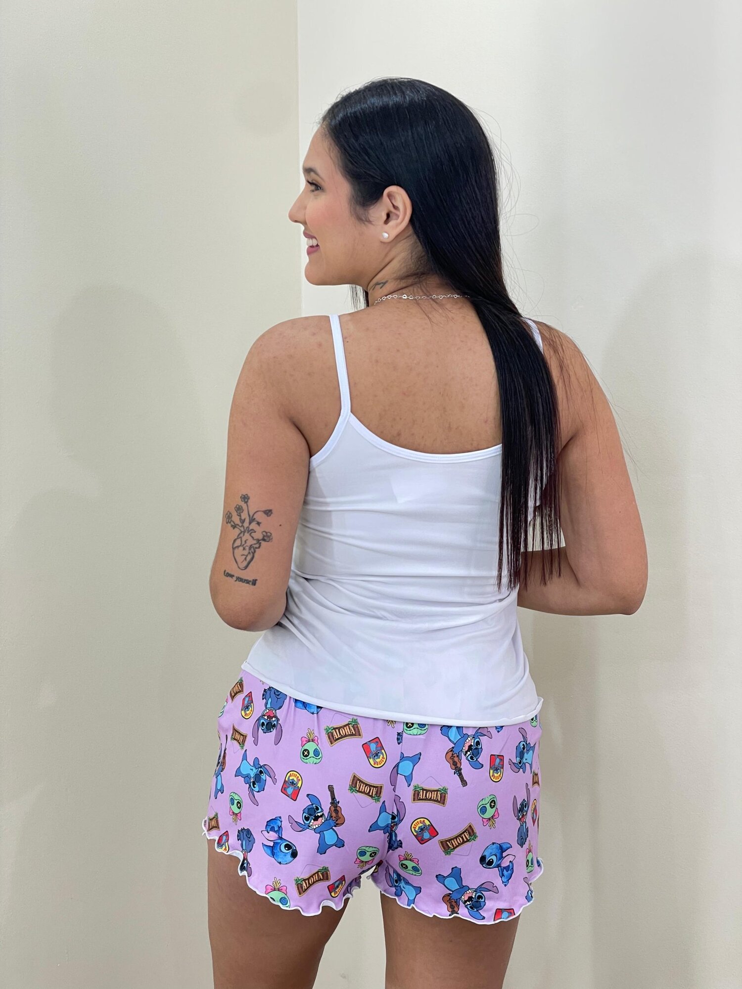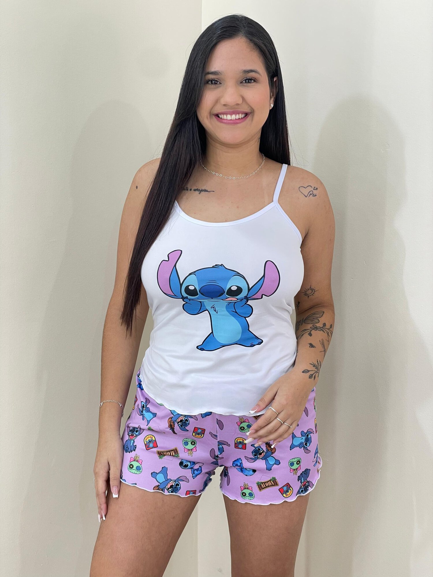 O Pijama Jade é perfeito para quem ama conforto com um toque de diversão! Com estampa inspirada no personagem Stitch, ele é ideal para noites leves e cheias de estilo.