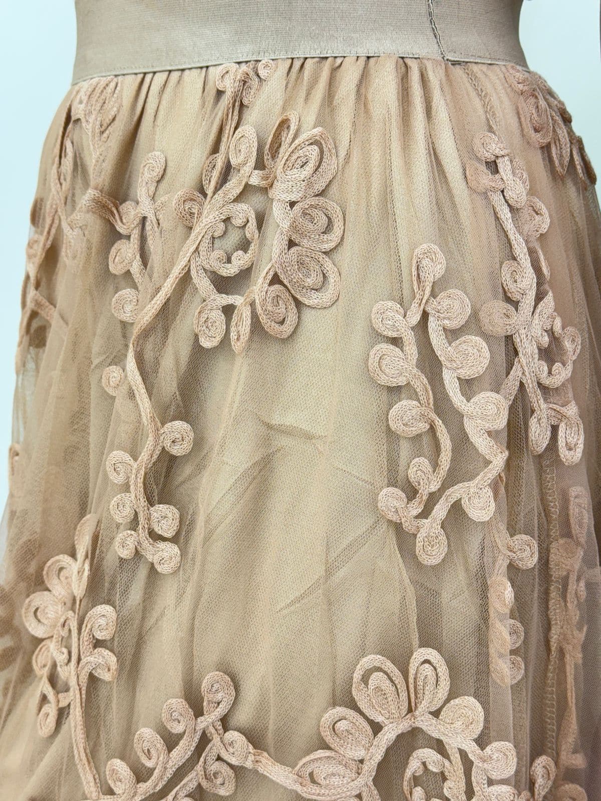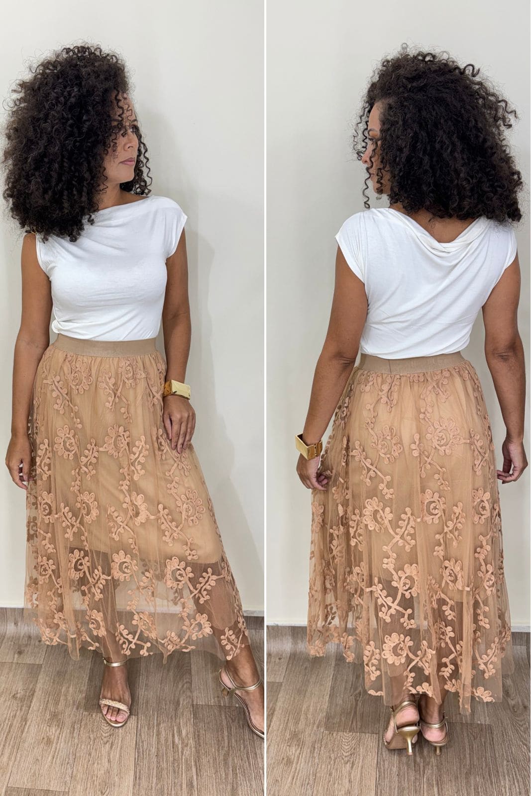 a Saia Longa Teresa é aquela peça que transforma qualquer produção em um visual sofisticado e feminino. Confeccionada em tule leve com bordados florais delicados, ela traz movimento e fluidez ao caminhar, criando um efeito encantador e atemporal.