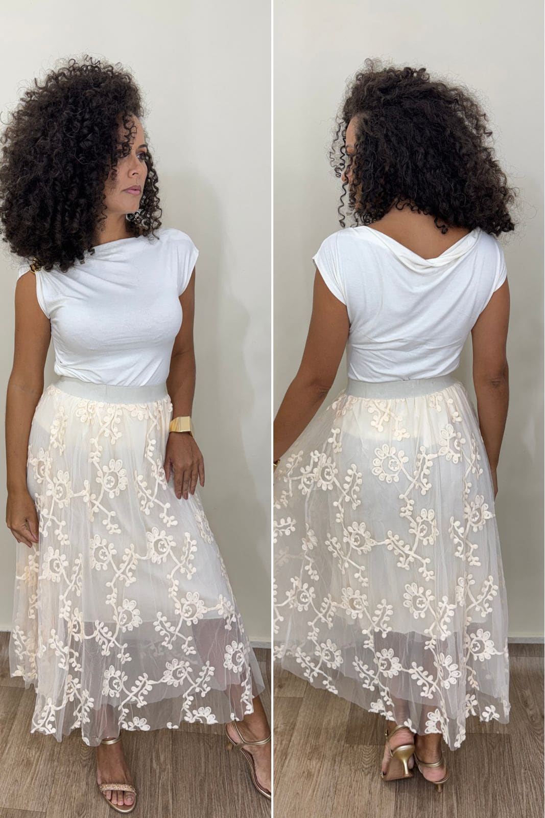 a Saia Longa Teresa é aquela peça que transforma qualquer produção em um visual sofisticado e feminino. Confeccionada em tule leve com bordados florais delicados, ela traz movimento e fluidez ao caminhar, criando um efeito encantador e atemporal.