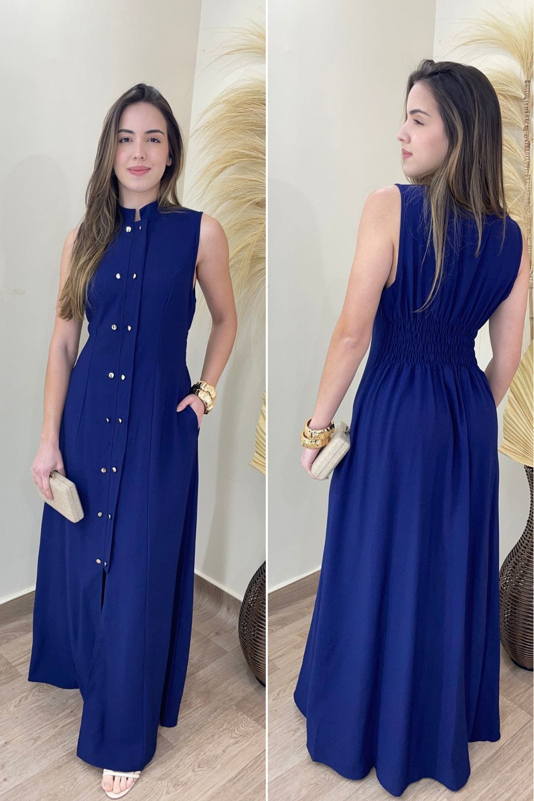 - Fechamento frontal com botões dourados